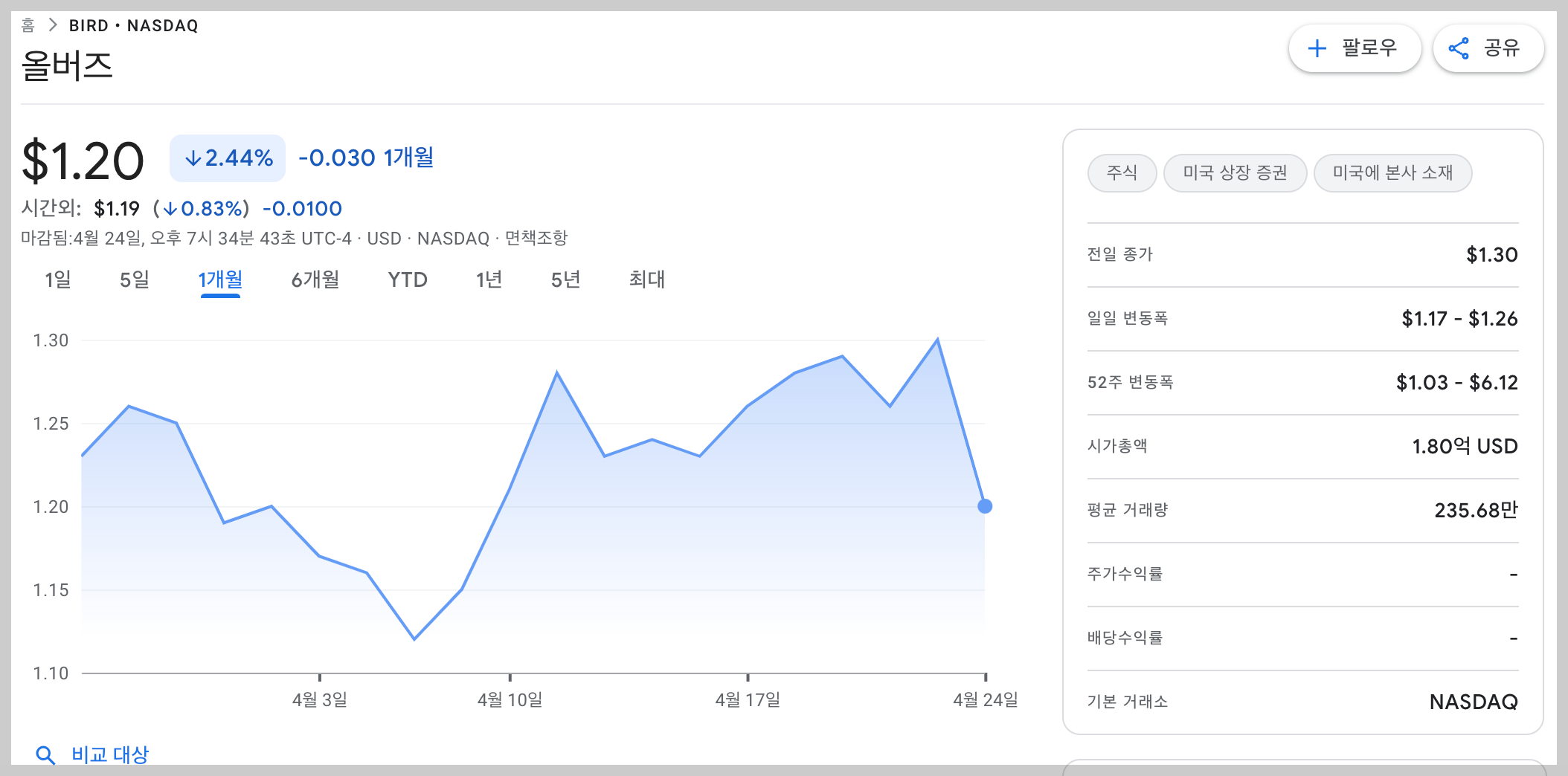 현재, 친환경 운동화에 테슬라급 기업  올버즈 주가는 2023년 4분기 실적에서 47% 폭락으로 이어졌습니다. 점점 엄습하는 경제의 불안감이 파도처럼 다가올 수 있는 불안감도 느낄 수 있는 기업의 가치입니다.